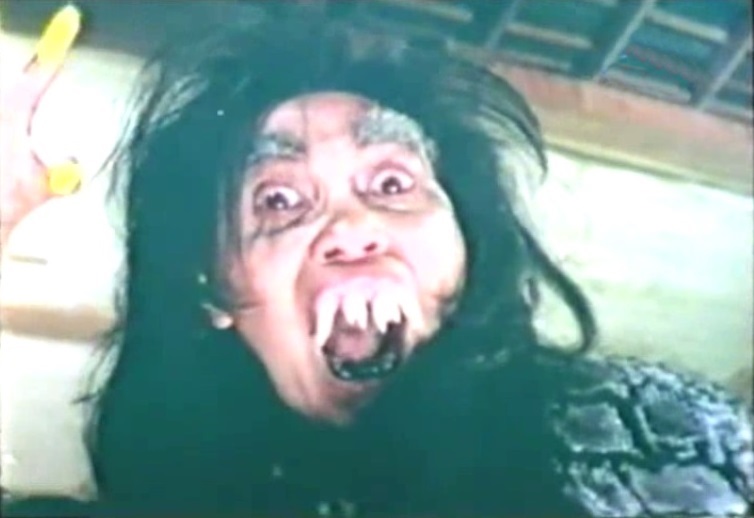 The wonderfully animated Sofia W.D. (who went on to play the Leák Queen in the aforementioned Mystics in Bali and also appeared in the Suzzanna vehicle Queen of Black Magic) stars as an old, ugly Penanggalan named Siluman (a word that translates to “demon”). Siluman is an extremely powerful, entirely evil, cackling, fetus-feasting witch with crazy hair and over-sized plastic fangs. Not only can she detach her head and send it after people (notably pregnant women whose fetuses she sucks directly out of you-know-where), but she can also shoot out her eyeballs to spy on others from afar, make animals do her bidding, disappear and reappear at will and transform into a younger, beautiful woman. The immature and non-religious Ban (Fadly), who lives on a modest, secluded farm with his pregnant wife Karta (Rina “Hassim” / Hasyim) and their young daughter Marni, sets out on foot for the local village to get some food. Siluman, who's been spying on his family and wants their upcoming baby to “be my dessert!” transforms into the lovely young Sumirah (Doris Callebaute). Sumirah calls forth her legion of cobras to attack her so that she can meet Ban when he rescues her.