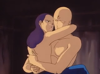 Mrs. Bishu has very personal reasons for bringing Reimu in to help: She suspects her own son, Tatsuhiko, is the thief. He's been studying parapsychology at a university in Tokyo and had previously talked about his desire to experiment on the doll. She believes he snatched it and then took it back to the city with him. Reimu heads off to Tokyo, leaving her bald monk friend and protector Enko behind so he can investigate the shrine. Mrs. Bishu's weird long-haired grandson, Onii, jumps at the chance to take him. Onii, who was previously shown attempting to slash Alpha and Beta with a razor just cuz and is deemed a "pervert" by his kid sister, gets struck by lightning before they arrive. Enkou takes him inside the shrine and strips off his own clothes to "warm him up." Onii starts licking Enkou's neck and shoulder, the two caress each other and then move in for a kiss before the camera cuts away (!!) So I was really not expecting to see an adult male monk and teen boy getting it on in this one, yet here we are...